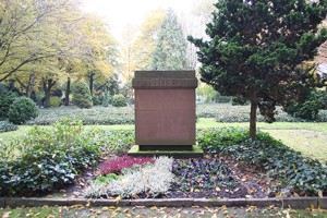 Im Hauptfriedhof ein Gedenkstein mit umlaufender Schrift, davor am Boden eine Gedenktafel