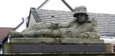 Bronzetafel auf dem Sockel vorne oben: 1914/18 UNSEREN OPFERN 1939/45