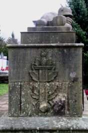 auf den Seiten des Sockels jeweils Relief eines Schwertes auf Eichenlaub, auf der Rückseite eine kaum noch