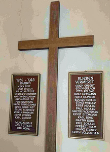 Denkmal für die Gefallenen des 1. Weltkriegs vor der Kirche: abgestufter Feldsteinsockel mit aufgesetztem Granitblock mit Namenstafel, umrandet von kleinen Pfeilern mit Kette. Gedenktafeln für die Gefallenen des 2. Weltkriegs in der Kirche. Gedenken auf Familiengräbern.