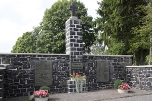 zwei Steinplatten angebracht. Mittig in der Wand ist ein aufgemauerte Säule mit einem steinernen Kreuz