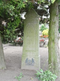 Der kleine Gedenkstein steht am Friedhofseingang der Dorfkirche unter einem Baum. Er ist am Sockel verziert mit