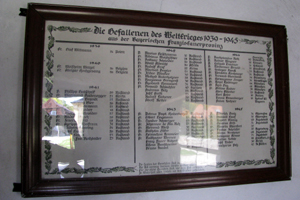 Im Franziskanerkloster hinter der Wallfahrtsbasilika befindet sich ein gerahmtes Papier mit den Namen der im 2. Weltkrieg Gefallenen aus der bayerischen Franziskanerprovinz. Daneben hängt ein Gedenkkreuz für einen gefallenen Soldaten.
