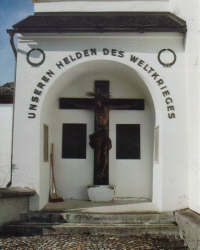 Vier Gedenktafeln, in der Mitte befindet sich ein Kruzifix (von Peter Sellemond aus Hall/Tirol, 1925);