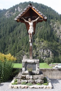 Im Friedhof; überdachtes Kreuz mit Kruzifix, am Sockel Gedenktafel