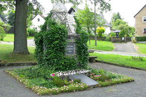 Natursteindenkmal 1914/18 mit gravierten Inschriften im Ortskern; gravierte Steinplatte 1939/45 vor dem Denkmal