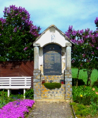 Gemauerter Bildstock mit zwei Säulen und Marienstatuette im Dachfirst westlich vom Ort im freien Feld