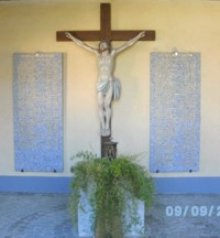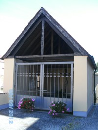 Überdachter Hallenbau, neben der Ortskirche mit Metalltoren. Davor bepflanzte Blumentröge. Im Inneren ein großes Kreuz und links bzw. rechts daneben die Namens- tafeln mit Inschrift und den Namen der Weltkriegsopfer.