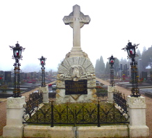 Säbel und einem Raupenhelm, gekrönt mit einem Kreuz, umfriedet mit einem Metallzaun mit vier