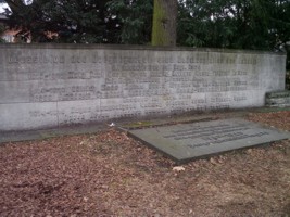 Linksseitig vom Denkmalsblock Steinwand und davorliegende Steinplatte mit Widmungen