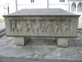 Auf dem Platz vor der Ritterkapelle befindet sich ein Steinsarkophag. Daran Inschrift mit Schwurhand, herausgeabreitete Marschkolonne mit Frauen- und Kinder-Begleitung.