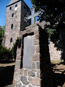 vor der Kirche; Denkmal 2. Weltkrieg, Findling auf Natursteinsockel mit angebrachter Namenstafel außerhalb der