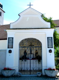 Namenstafeln an der Außenwand einer Kapelle neben der Kirche.