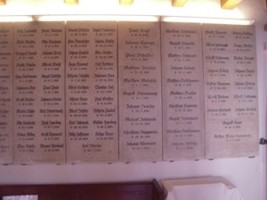 In der Johanneskirche hängen im Eingangsbereich eine Vielzahl von Sandsteintafeln mit Namen von Gefallenen des 1. Weltkrieges.