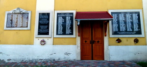 An der Kirchenaußenwand, links und rechts vom Eingang, angebrachte vier Tafeln.