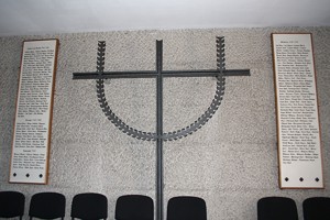 In der Friedhofskapelle zwei Gedenktafeln, dazwischen ein Kreuz