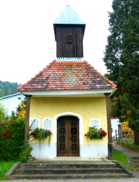 Namenstafeln an der Außenwand beiderseits des Eingangs zu einer Kapelle neben Haus Grazer Straße 100