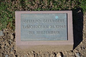 Bestattet wurden hier auch 81 Frauen und 6 Männer, die wenige Tage vor dem Einmarsch der amerikanischen Truppen, in Hirzenhain von Gestapo und SS ermordet und in einem Massengrab im Wald verscharrt wurden.