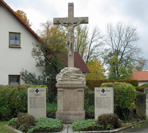 Zentrales Steindenkmal mit Hochkreuz und gravierten Inschriften des 1. Weltkriegs, daneben links und rechts je ein
