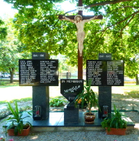Neben der Kirche stehen vor einem Holzkreuz mit Gekreuzigtem zwei
