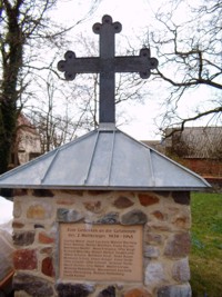 Denkmal 1. und 2. Weltkrieg, überdachter Feldstein Quader, gekrönt von einem Kreuz; Gedenkepitaph