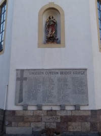An der Außenwand der Kirche in Langenleiten erinnern Namenstafeln an die Opfer beider Weltkriege.