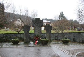 Im Friedhof; drei Steinkreuze, an der Mauer Gedenktafeln