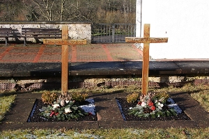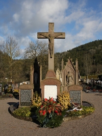 Im Friedhof ein Kreuz auf einem Sockel, vorne Namenstafel, flankiert von zwei stehenden Gedenktafeln;