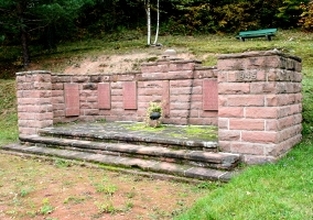 besteht aus einer Sandsteinmauer in Form eines einseitig offenen Rechtecks, darauf das Relief eines Kreuzes mit