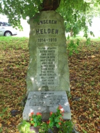 Grob in Form gebrachter Felsstein. Dazu gelegte Steinplatte für den 2. Weltkrieg.