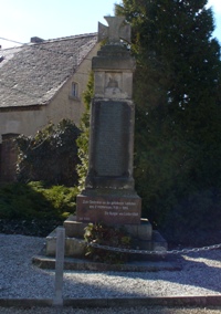 Stele mit Ehrenkreuz darauf in der Ortsmitte, neben der evangelischen Kirche.