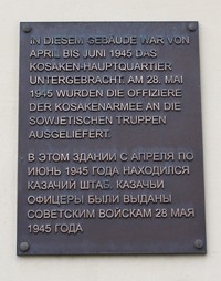 In diesem Gebäude war von April bis Juni 1945 das Kosaken-Hauptquartier untergebracht. Am 28 Mai 1945 wurden