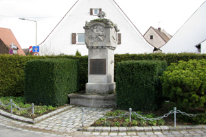 Die Steinsäule zeigt ein Relief des heiligen Georg. Darunter sind die Namen auf einer Metalltafel