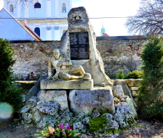 Naturstein mit sitzender Soldatenskulptur eingefriedet mit