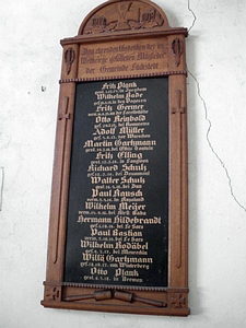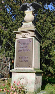 Denkmal für die Gefallenen des 1. und 2. Weltkriegs: Säule mit Adler (ohne Namen). Gedenktafel für die Gefallenen des 1. Weltkriegs in der Kirche. Ehrenliste für die Gefallenen des 1. Weltkriegs.