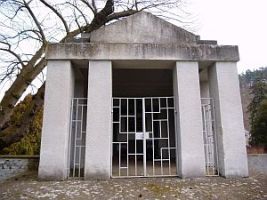 Kreuz, innen angebrachte Namenstafeln; Denkmal 1. und 2. Weltkrieg am Friedhof in Form eines Mausoleums