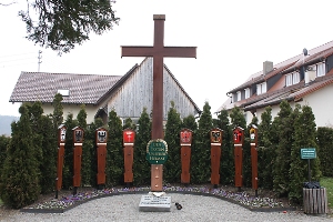 Im Friedhof Hochkreuz und im Halbkreis herum Holztafeln mit Wappen