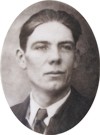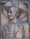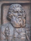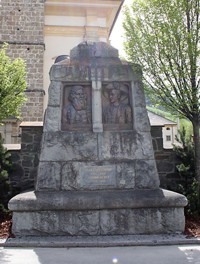 Vor dem Friedhof eine steinerne Pyramide; vorne Gedenktafel und zwei Bildnisse.
