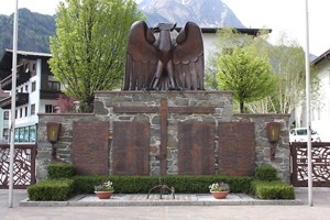 Im Friedhof eine gemauerte Wand mit Gedenktafeln und Kreuz, darauf ein kupferner Adler.