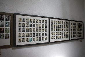 In der alten Friedhofskapelle; vier Tafeln mit Namen und Fotos der Gefallenen