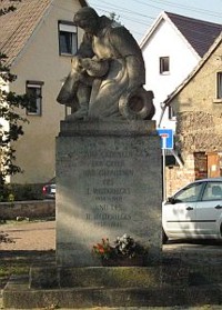 Freistehender Kubus mit knieendem Krieger als Abschluss auf einem kleinen Platz an