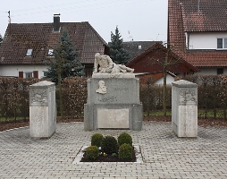 Vor dem Friedhof ein dreiteiliges Denkmal in U-Form; am mittleren Teil oben Steinplastik „Soldat“; zusätzlich Hinweise zu Soldaten von privaten Gedenksteinen