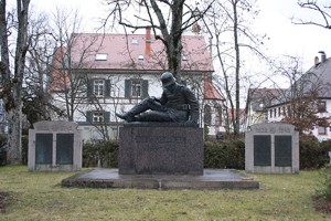 Bei der Kirche; auf einem Marmorsockel sitzender Soldat, seitlich Gedenktafeln, etwas zurückgesetzt zwei