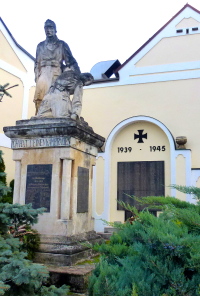 zweier Soldaten. Namenstafeln aus dem 1. Weltkrieg auf vier Seiten. An der Hauswand dahinter Namenstafel aus
