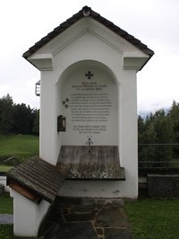 Im Friedhof eine vorne offenen Gedenkkapelle, in der Mitte Inschriften.
