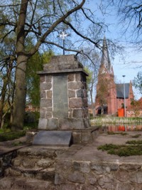 Denkmal 1. und 2. Weltkrieg, Feldstein Quader mit abgestuftem Oberteil, gekrönt von einem Kreuz,