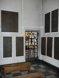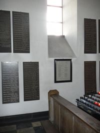 Hölzerne Tafeln in der Kirche; die Vermißten auf einem gerahmten Druck