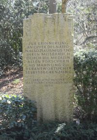 ZUR ERINNERUNG AN OPFER DES NATIONALSOZIALISMUS UND IHREN MISSBRAUCH DURCH DIE MEDIZIN. ALLEN FORSCHERN ALS MAHNUNG ZU VERANTWORTLICHER SELBSTBEGRENZUNG.