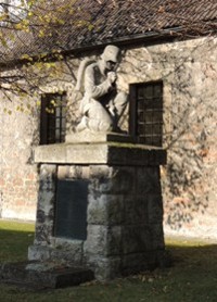 Kriegstoten beider Weltkriege. Auf einem Sockel die Plastik eines Soldaten im Gebet, am Natursteinsockel
