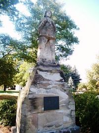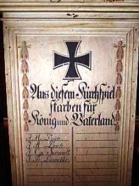 Denkmal 1. Weltkrieg, Sandsteinpyramide mit krönender Soldatenfigur und zusätzlich angebrachter Metallplakette; Gedenkkreuz und Gedenktafeln in der Kirche